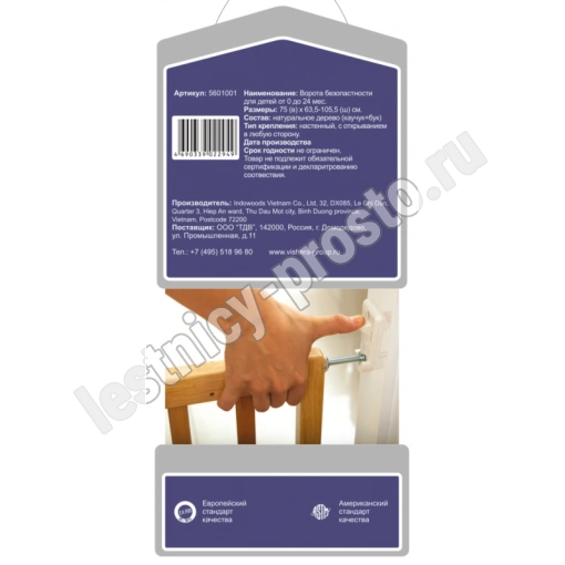 Изделие имеет раздвижную конструкцию с большим диапазоном - от 63.5 до 105 см и может быть установлено в любые дверные или лестничные проемы, в качестве основного материала используется натуральное дерево (бук) с высококачественной шлифовкой.