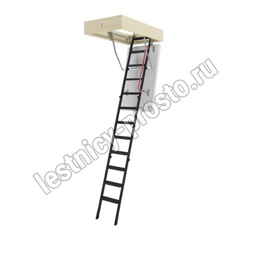 Лестница обладает повышенной теплоизоляцией и низкими показателями воздухопроницаемости крышки. Облегченная крышка люка изготовлена из пенополистирола без применения дополнительных деревянных элементов. Наконечники имеют возможность регулировки, что позволяет подогнать длину лестницы по высоте помещения в случае излишнего подрезания лестницы или изменения толщины пола.