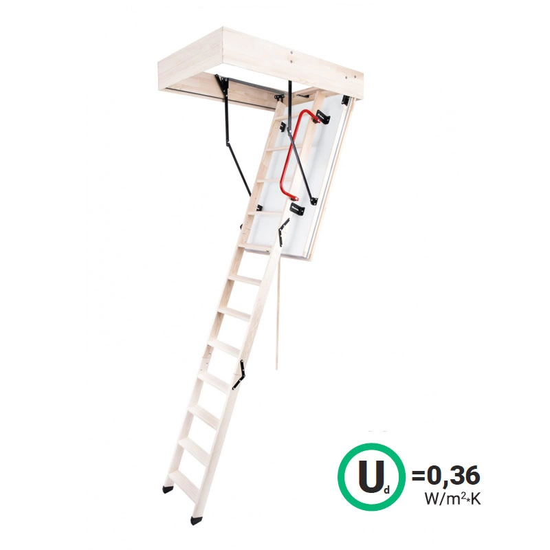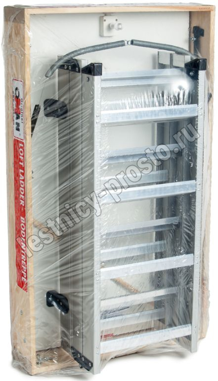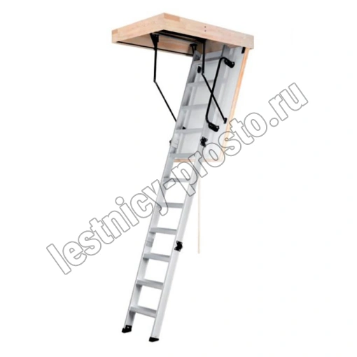 Складная 4-х секционная чердачная лестница. Рабочая поверхность полностью выполнена из алюминия. Термоизоляционная крышка типа "сэндвич" имеет усиленную теплозащиту, облицована с двух сторон ДВП белого цвета. По контуру короба имеется уплотнитель; Все металлические элементы лестницы покрыты порошковой краской.