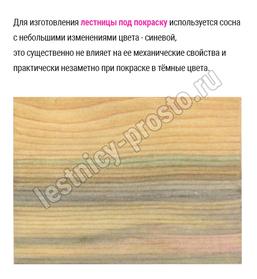 Для изготовления лестницы под покраску используется сосна с небольшими изменениями цвета - синевой, такой допустимый порок древесины существенно не влияет на ее механические свойства и практически незаметен при покраске в тёмные цвета.