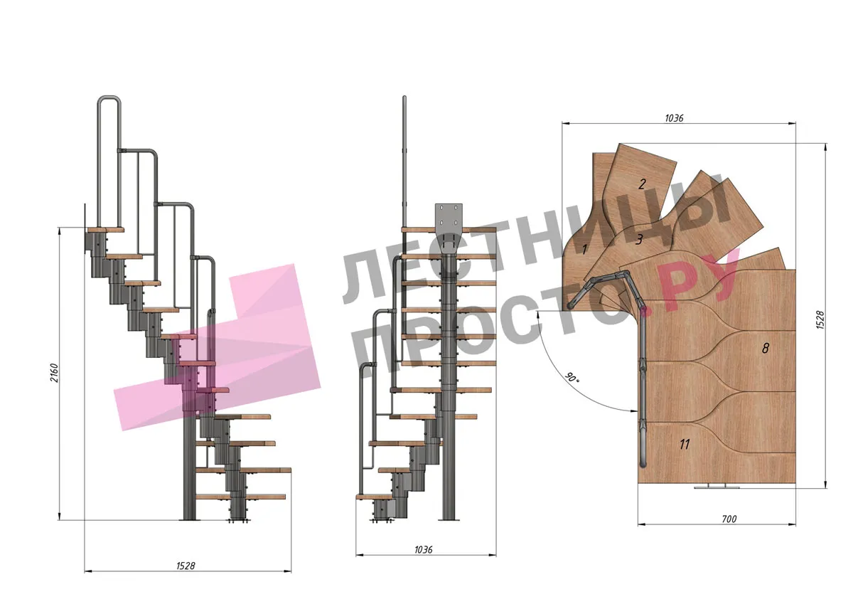 Лестница Prosto Urban Black гусиный шаг 700 мм, h198-288 см (11 ступеней), ясень