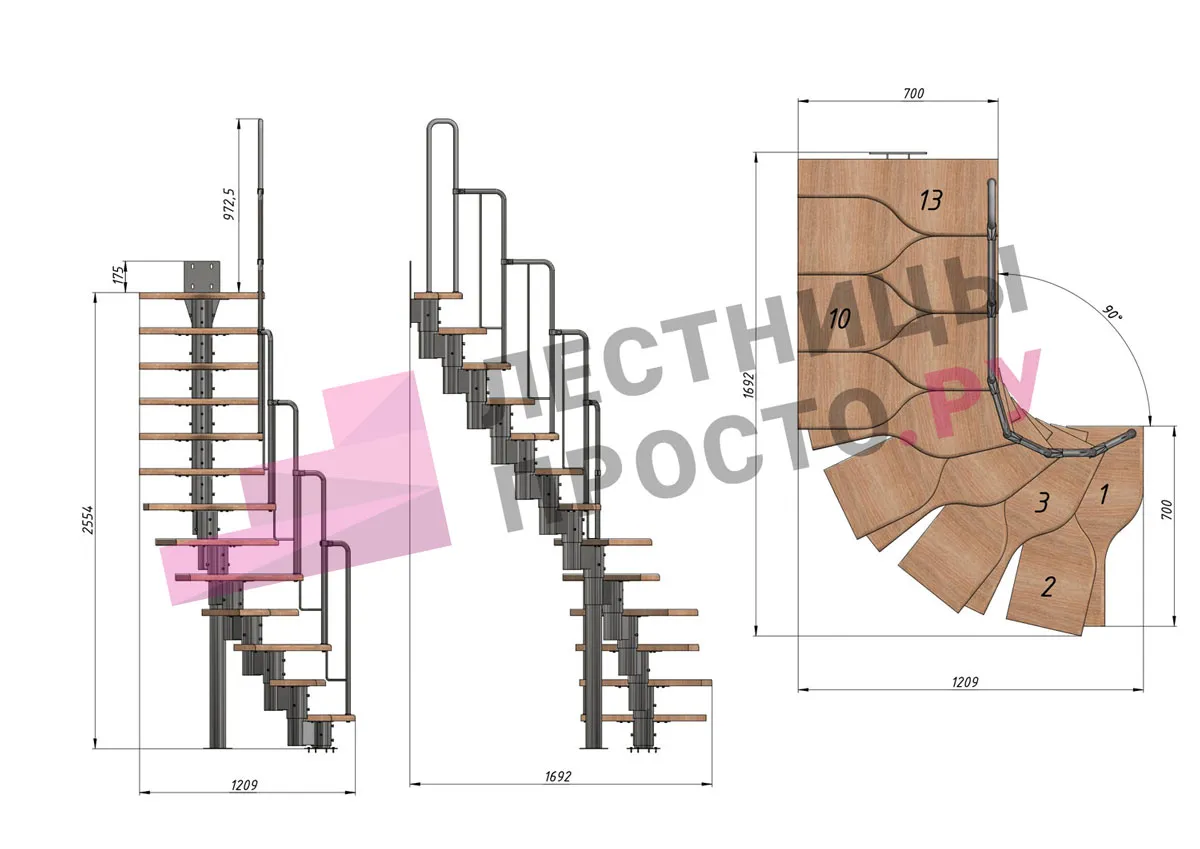 Лестница Prosto Urban Black гусиный шаг 700 мм, h234-336 см (13 ступеней), бук