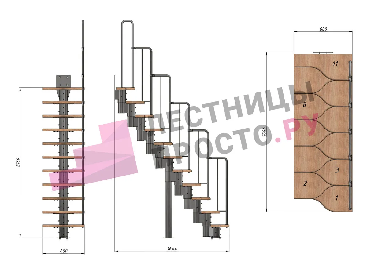 Лестница Prosto Urban Black гусиный шаг 600 мм, h198-288 см (11 ступеней), ясень