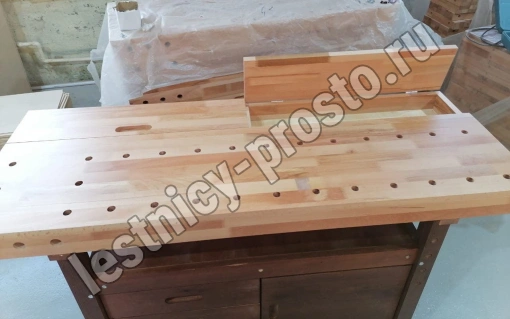 Комплектация: 2 комплекта тисков, 2 пенала в столешнице, 3 ящика, 1 шкафчик, полка.