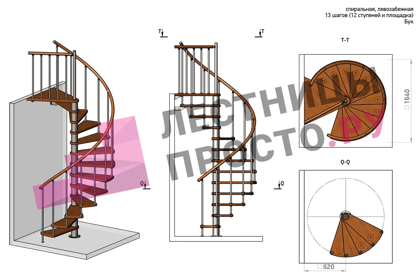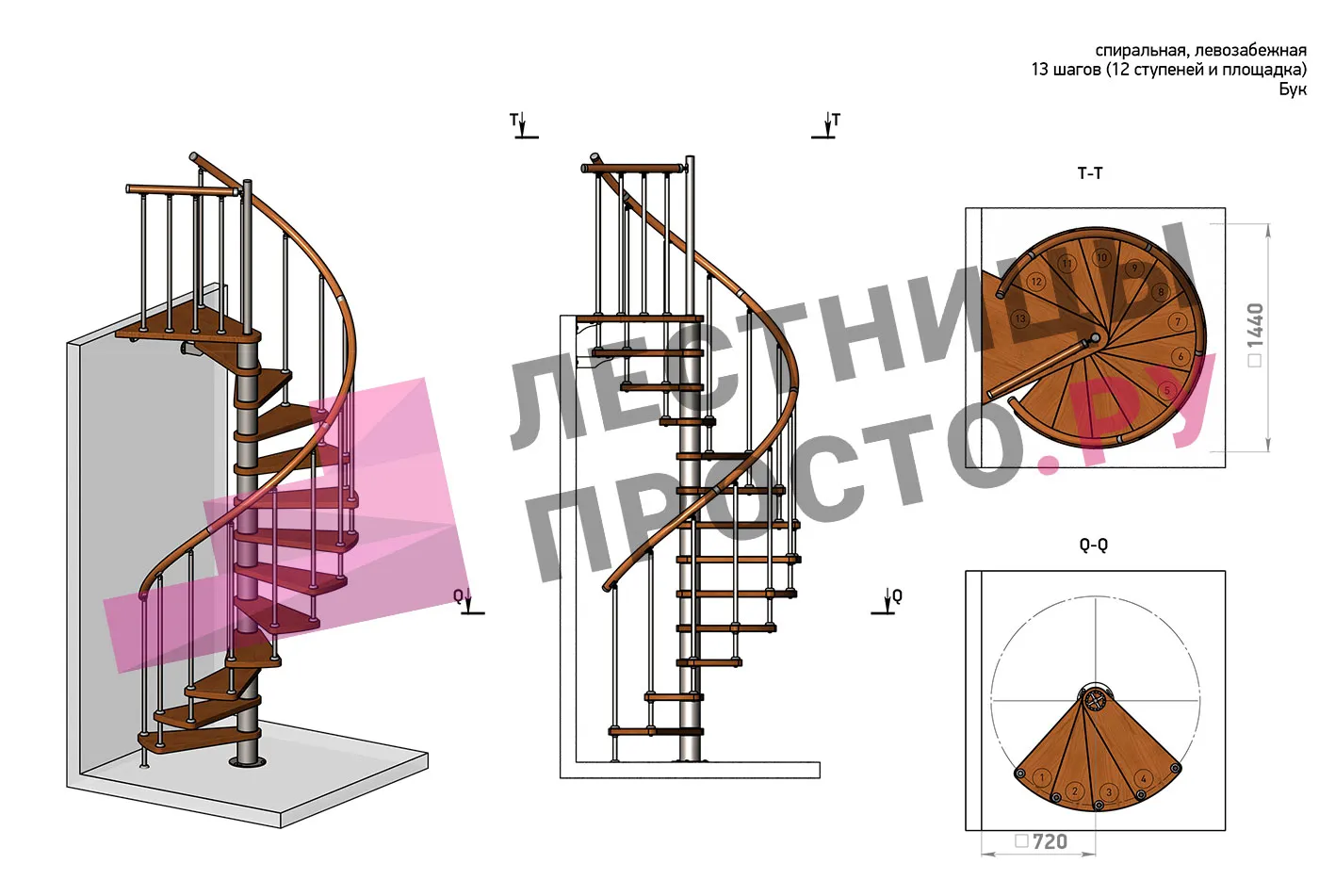 Левая, d=120см, 13 ступеней + площадка