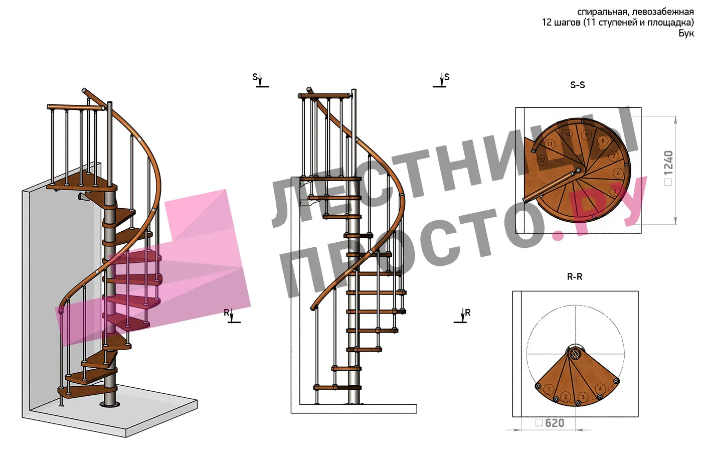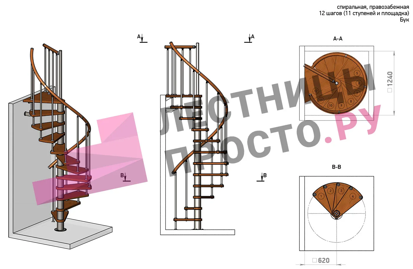 Правая, d=120см, 12 ступеней + площадка