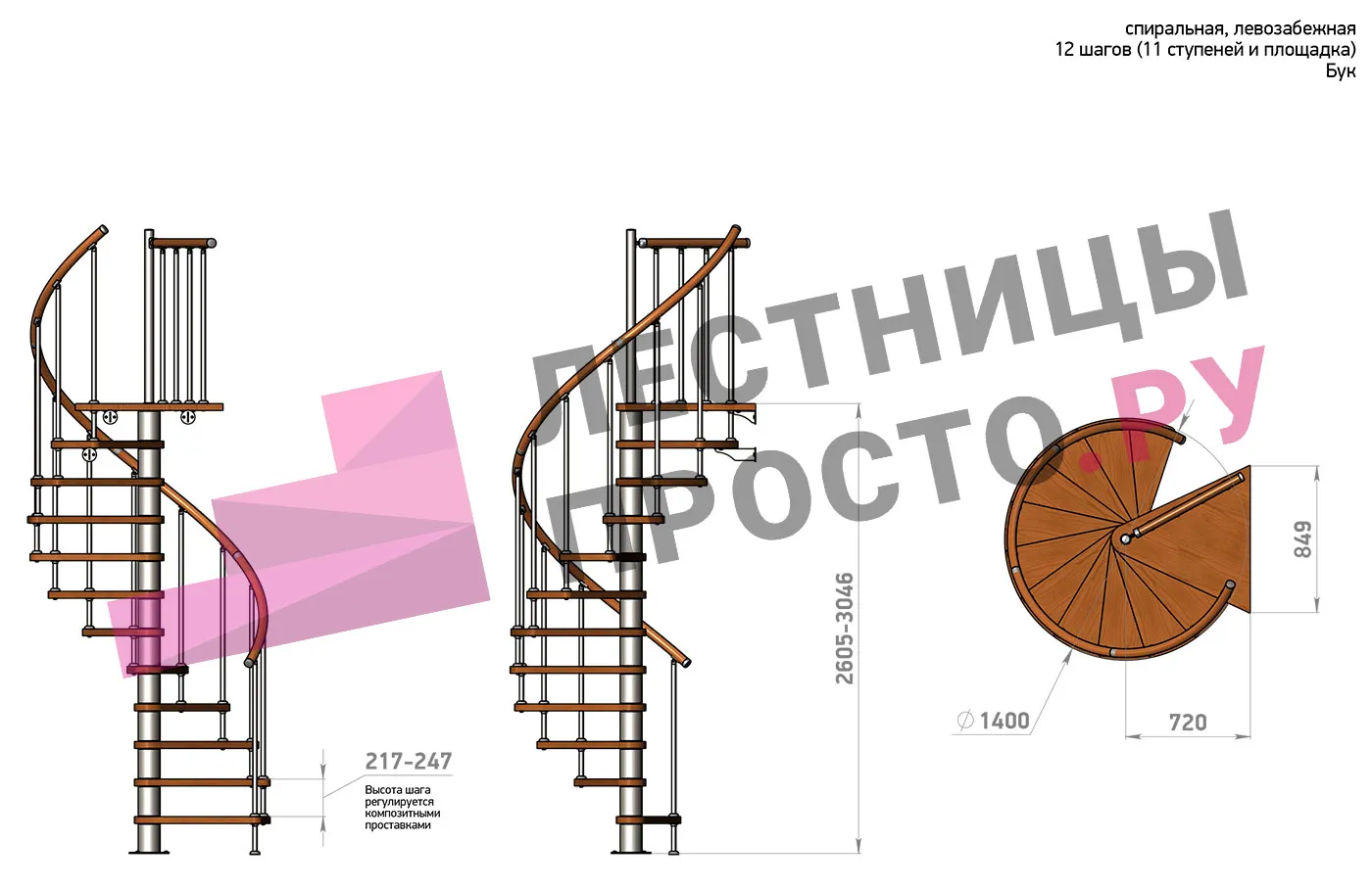 Левая, d=140см, 12 ступеней + площадка